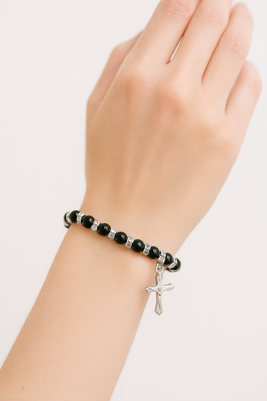 Black Beaded Bracelet with Cross Charm – Elastic Fit