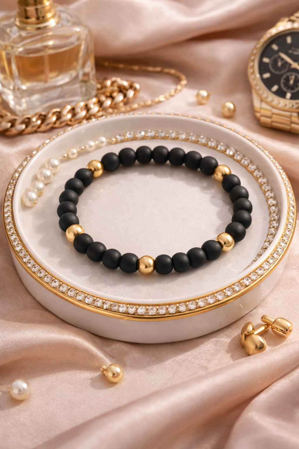 Elevate your everyday style with this elegant black matte beaded bracelet, beautifully accented with polished gold beads for a refined touch of luxury. Designed with a minimalist aesthetic, this bracelet blends modern simplicity with timeless sophistication, making it a versatile accessory for both casual and special occasions.